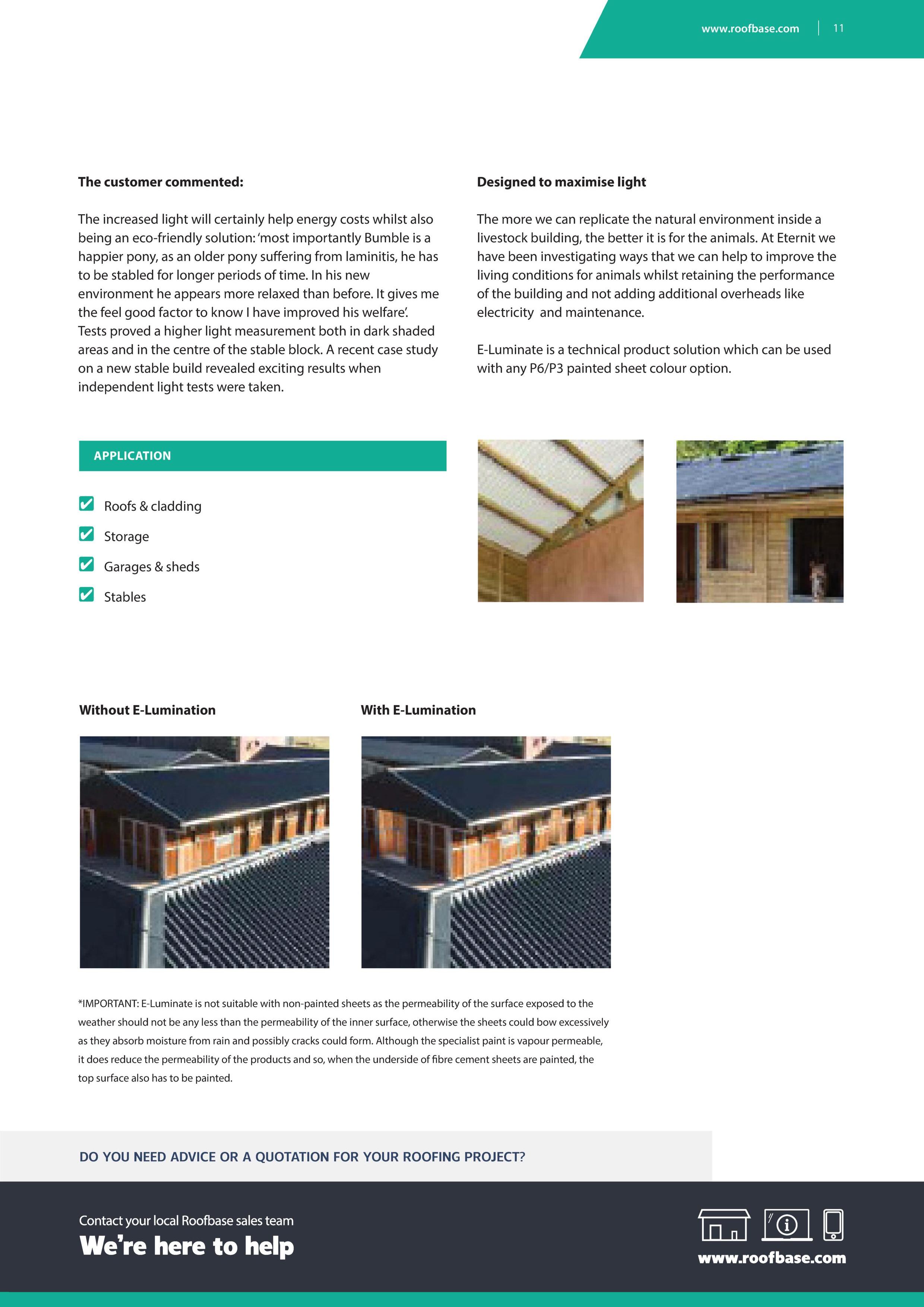 E-Luminate* products feature a special off-white paint coating to a painted sheet underside, researched and designed to increase light to internal livestock areas or agricultural buildings. Standard P6 and P3 painted sheets are now available with E-Luminate (POA). Supplying outstanding and long-lasting quality since the 1960’s.