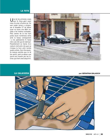 na de les primeres coses que fa força gent quan neva, és anar a buscar pa. Ho vam poder tornar a comprovar el dissabte 27 de febrer quan va caure una dèbil nevada a les nostres contrades. Pels carrers de la vila hom podia veure nombrosos veïns amb la bossa corresponent i a les pastisseries hi havia més cues del que és habitual. Possiblement es tracta d’un costum molt antic de quan se n’anava la llum amb només quatre volves. Avui dia aquesta mesura sembla que no té tan sentit, però ja sabem que sovint ens movem per les rutines que hem anat adquirint.