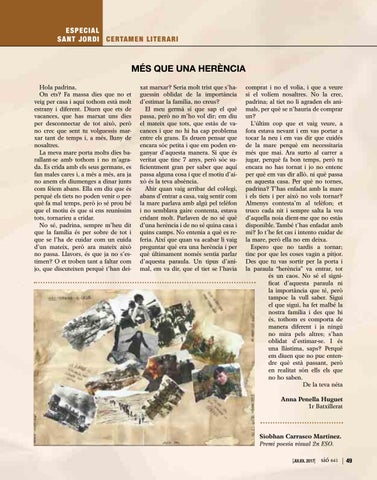 comprat i no el volia, i que a veure si el volíem nosaltres. No la crec, padrina; al tiet no li agraden els animals, per què se n’hauria de comprar un? L’últim cop que et vaig veure, a fora estava nevant i em vas portar a tocar la neu i em vas dir que cuidés de la mare perquè em necessitaria més que mai. Ara surto al carrer a jugar, perquè fa bon temps, però tu encara no has tornat i jo no entenc per què em vas dir allò, ni què passa en aquesta casa. Per què no tornes, padrina? T’has enfadat amb la mare i els tiets i per això no vols tornar? Almenys contesta’m al telèfon; et truco cada nit i sempre salta la veu d’aquella noia dient-me que no estàs disponible. També t’has enfadat amb mi? Jo t’he fet cas i intento cuidar de la mare, però ella no em deixa. Espero que no tardis a tornar; tinc por que les coses vagin a pitjor. Des que tu vas sortir per la porta i la paraula “herència” va entrar, tot és un caos. No sé el significat d’aquesta paraula ni la importància que té, però tampoc la vull saber. Sigui el que sigui, ha fet malbé la nostra família i des que hi és, tothom es comporta de manera diferent i ja ningú no mira pels altres; s’han oblidat d’estimar-se. I és una llàstima, saps? Perquè em diuen que no puc entendre què està passant, però en realitat són ells els que no ho saben. De la teva néta Anna Penella Huguet 1r Batxillerat