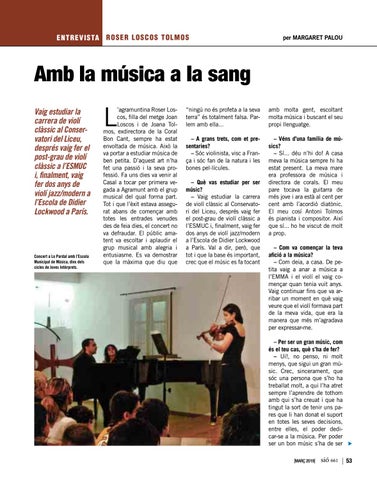 – Com va començar la teva afició a la música? – Com deia, a casa. De petita vaig a anar a música a l’EMMA i el violí el vaig començar quan tenia vuit anys. Vaig continuar fins que va arribar un moment en què vaig veure que el violí formava part de la meva vida, que era la manera que més m’agradava per expressar-me. – Per ser un gran músic, com és el teu cas, què s’ha de fer? – Ui!, no penso, ni molt menys, que sigui un gran músic. Crec, sincerament, que sóc una persona que s’ho ha treballat molt, a qui l’ha atret sempre l’aprendre de tothom amb qui s’ha creuat i que ha tingut la sort de tenir uns pares que li han donat el suport en totes les seves decisions, entre elles, el poder dedicar-se a la música. Per poder ser un bon músic s’ha de ser [MARÇ 2019]