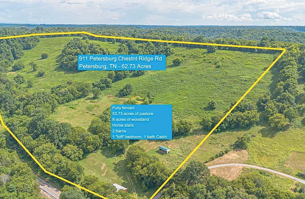 Beautiful 62+ acres fully fenced property in the heart of Lincoln County - ready for livestock, horses, or peaceful country living! This versatile land features 53.73 acres of pasture with 8 acres of woodland offering the perfect balance of open space and privacy. Equipped for equestrian use, the property includes horse stalls, horse run and 2 barns, along with a 14x26 one "loft" bedroom one bath cabin - perfect for guests, a weekend getaway or potential rental income. Utilities are there, including electric, water & septic. 2 Ponds on property. Propane Gas for heat. MUST be with an Agent to view this property. Land stretches from Petersburg Chestnut Road over to Shelbyville Hwy - road frontage on both ends. $749,000. MLS #2936719