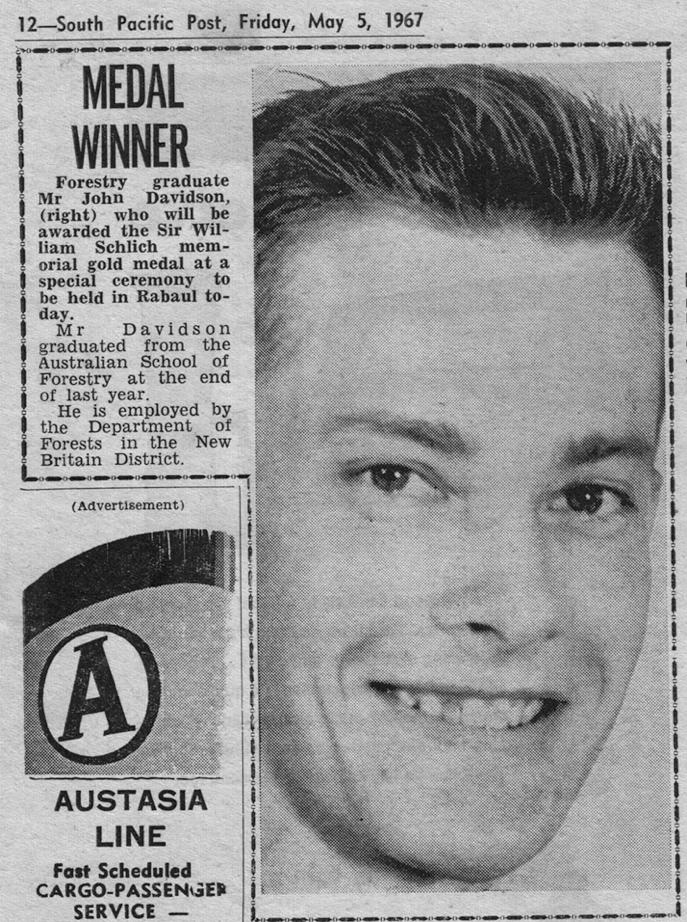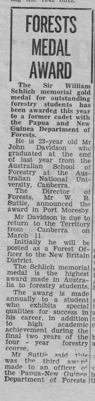 I was surprised to find that my Schlich Medal20 had been sent in secret by Dr Max Jacobs from Canberra to Rabaul with one of the tour participants, Col L W Bryan, a forestry consultant based in Kailua-Kuna, Hawai`i, USA, who made the formal presentation of the Medal to me at this District Commissioner’s function. I was the third officer of the Department of Forests to be awarded the Schlich Medal, but only the second serving officer, as noted in the press at the time. The first was actually J B McAdam21 in 1933, before he became a Forest Officer in the Territories in 1948. The second awardee, and first serving