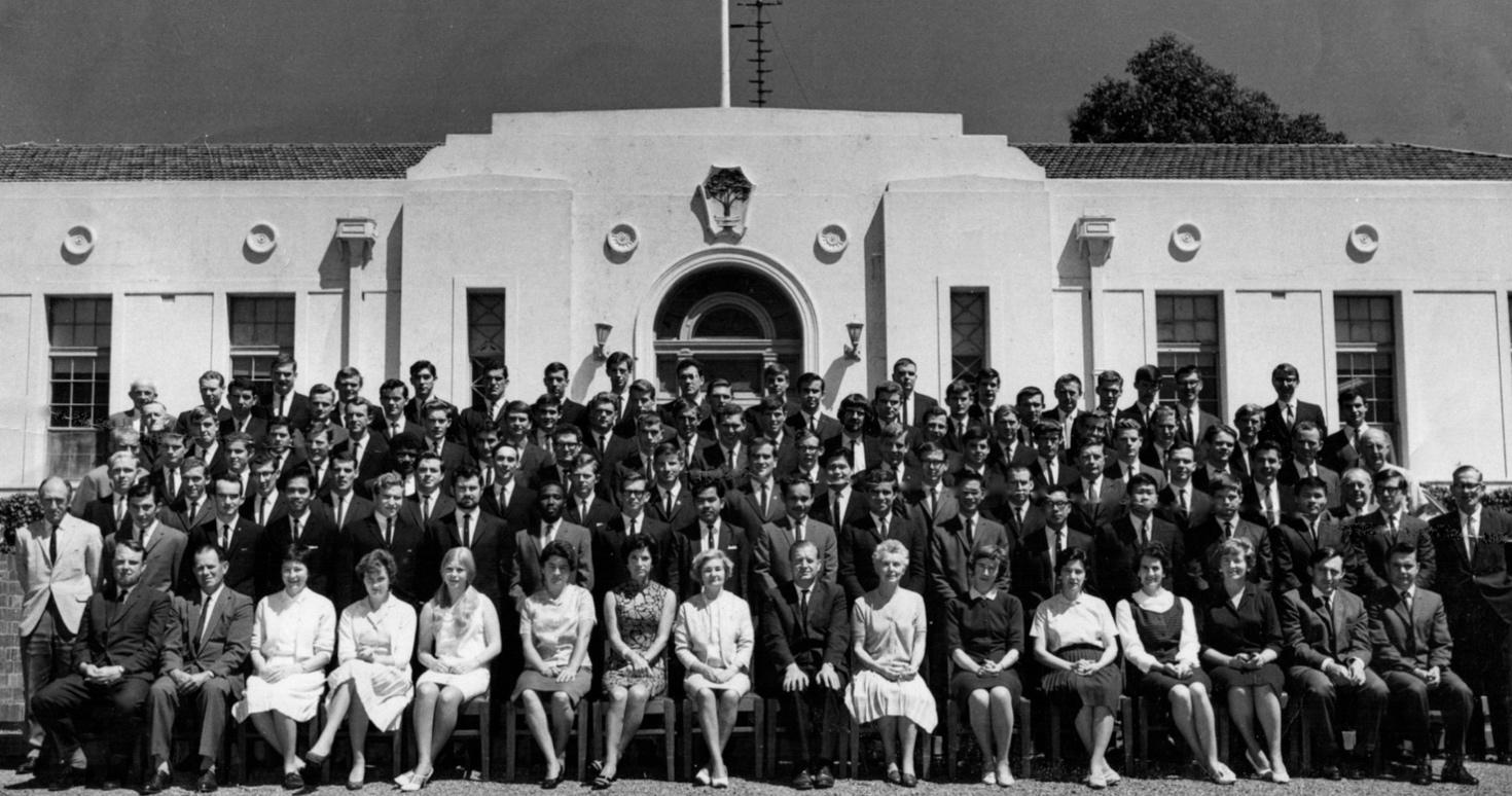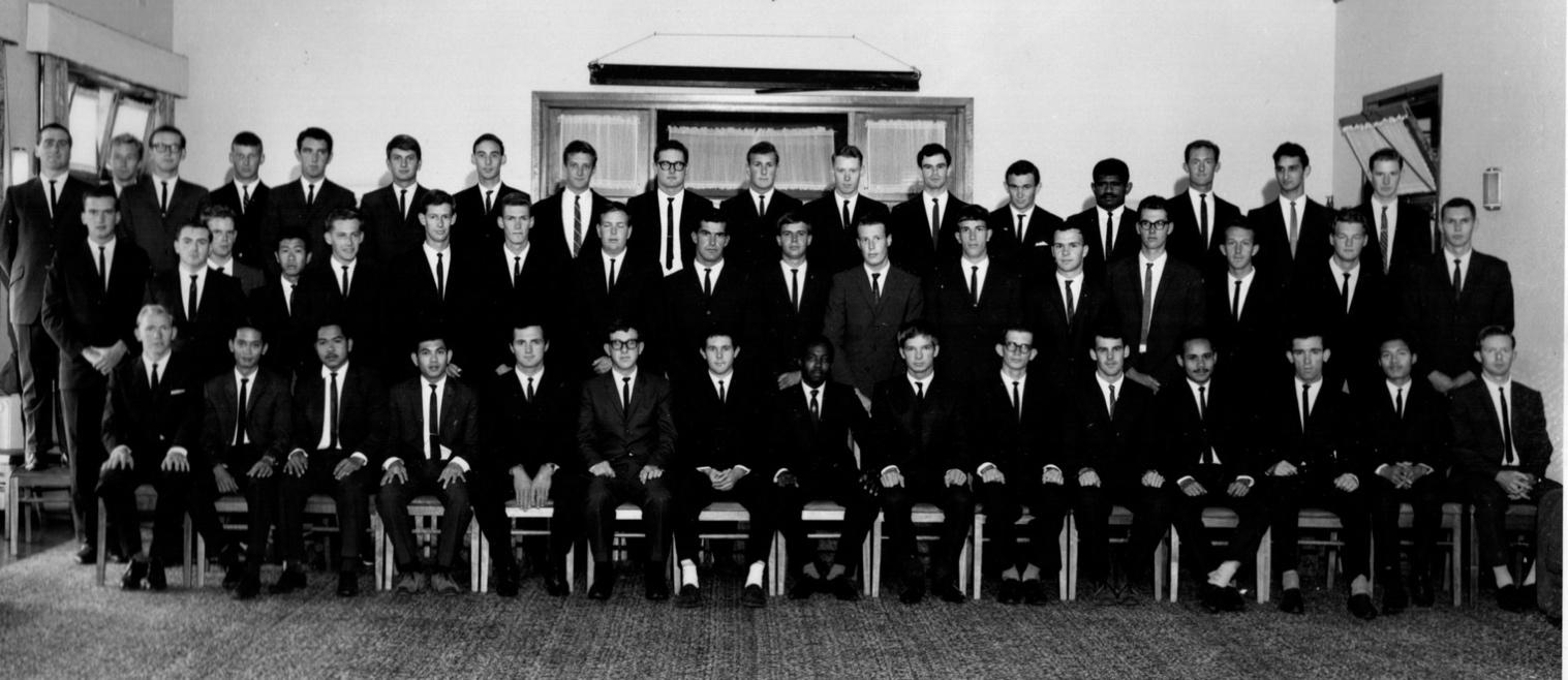 Listed left to right, with home State/Country of origin for students (names without State/Country were staff): Front row, seated on floor: Udarbe (North Borneo), Chai (Malaysia), Cheah (Malaysia), Harun bin Ismail (Malaysia), Grimmet (Qld), Low Beng Hock (Malaysia), Holesgrove (SA), Noordin (Malacca), Temu (Tanganyika), Sheik Ibrahim (Malaysia), Johnston (Qld), Sands (Qld), Hitchcock (NSW).