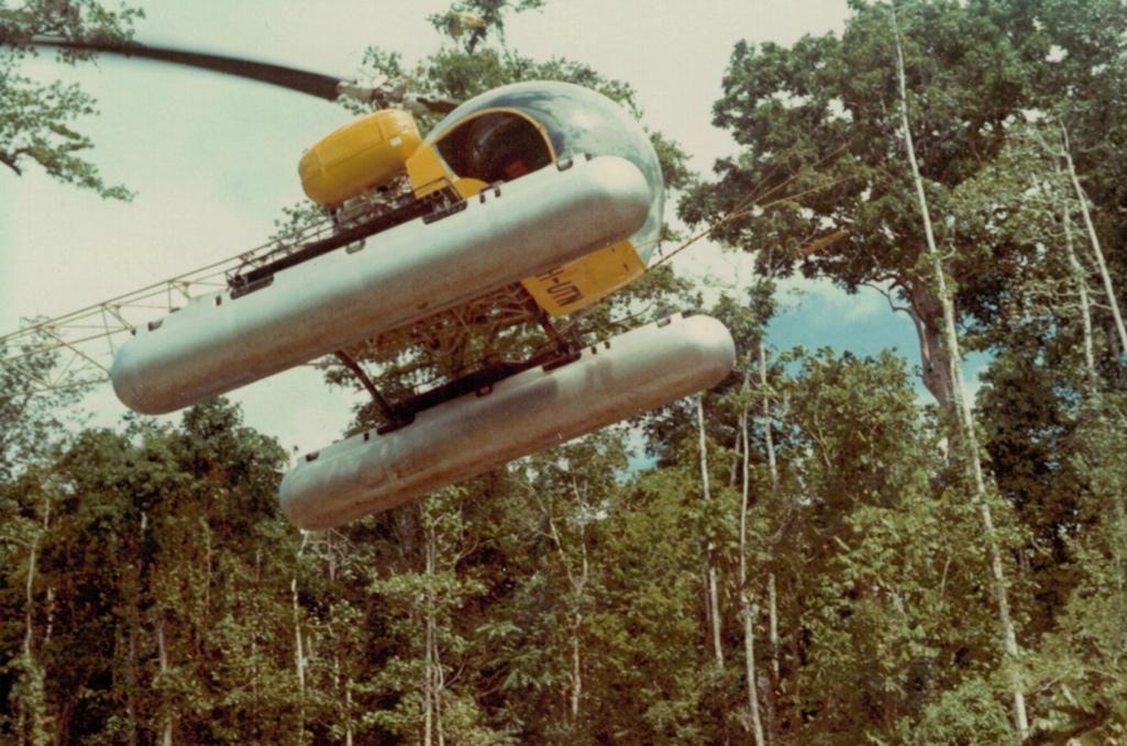 A number of straight-line surveys in the local forest areas near the coast was carried out by a team of four comprising me and three local Technical Officers (graduates of the Forestry College in Bulolo). Each survey line was pre-planned in the “office” tent based on previously interpreted air photographs, and a landing site chosen for the helicopter usually on a sand or shingle bank of a river or stream or on land near a village, where sometimes a landing pad had been cleared beforehand using a chainsaw, axes and bush knives by a team that had walked in.