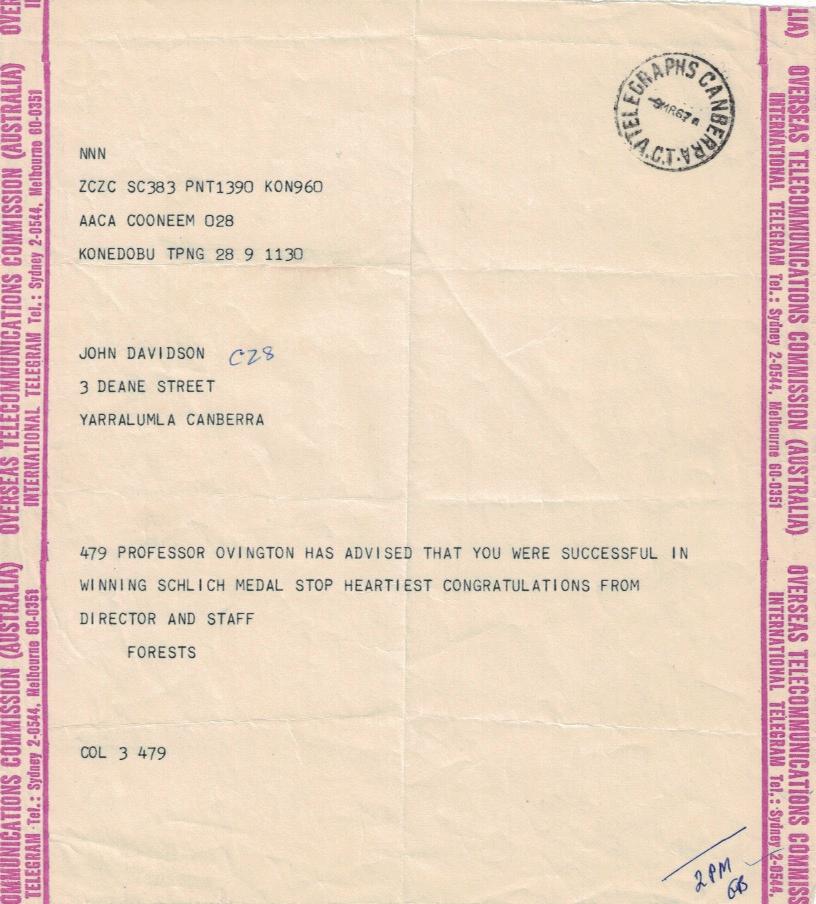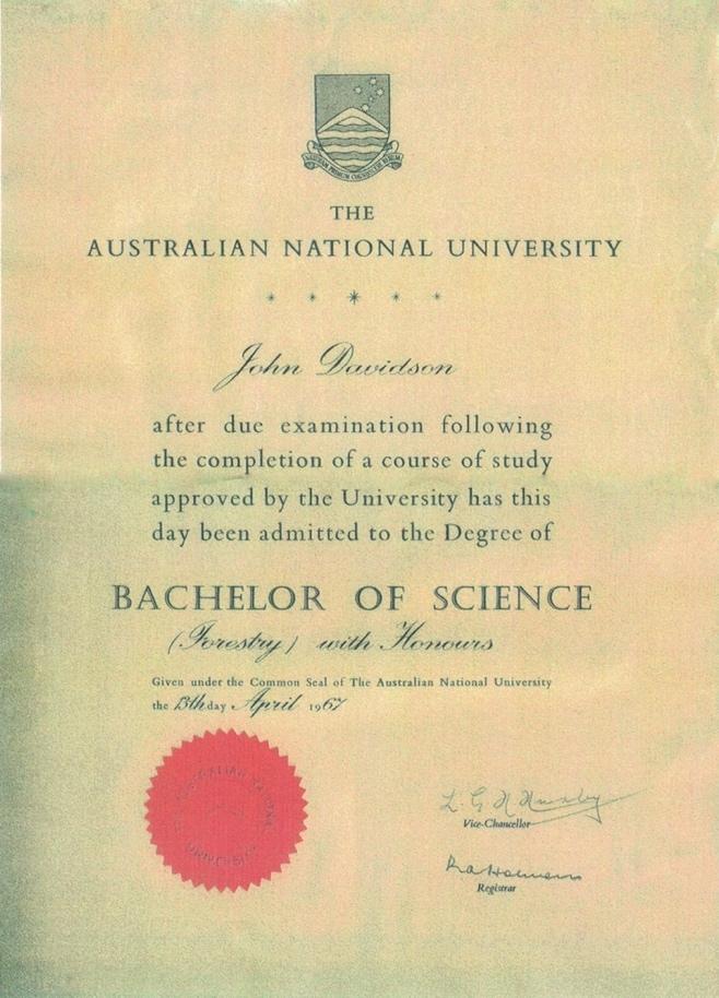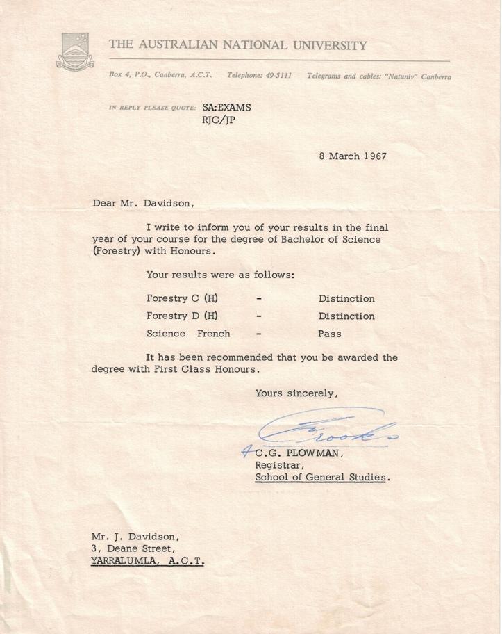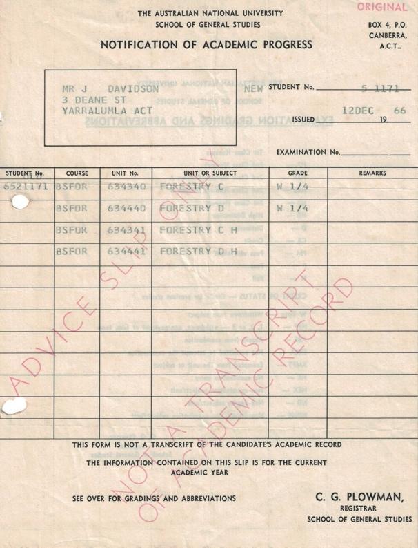 Since the University opposed the number and structure of the units as inappropriate for a university degree, these and other results were distilled into the single grade for BSFOR Forestry III in 1965. I was given a “D” (Distinction), which was formally notified in an “Advice Slip” dated 16 December 1965 and posted to my home in Clybucca. These results were recast again in 1967 to give a separate grade for each of Forestry IIIA and Forestry IIIB.