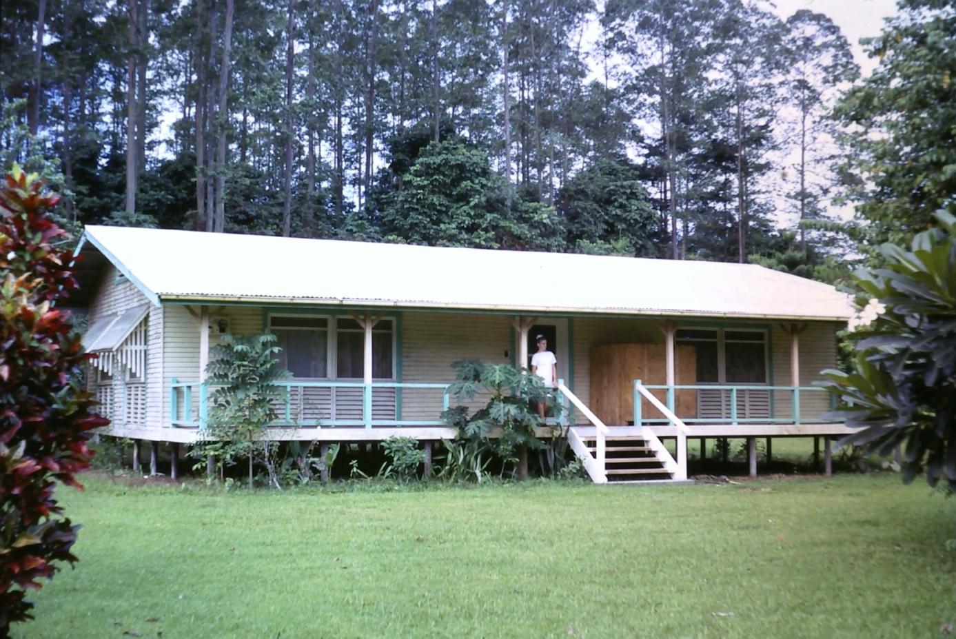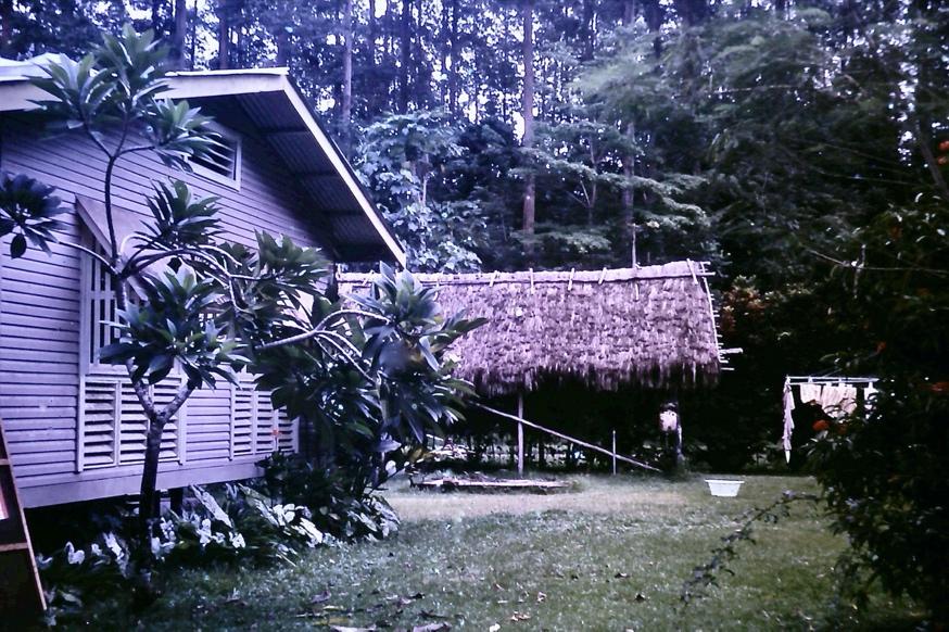 “Our” house at Keravat in May 1967 before a repaint. It was of early post-WW II timber horizontal weatherboard construction. The kitchen and bathroom were separated from the three bedrooms and large open dining-living room by a very effective internal breezeway with a screened door at each end. The floorboards throughout were kwila (Intsia bijuga). The empty lift van made out of radiata pine tongueand-grooved boards that contained our effects shipped from Yarralumla, Canberra sits on the wide verandah. The lift van had been temporarily “lost” in the Rabaul docks area and was eventually found stored out in the open! Thanks to the waterproof roof fitted to it in Canberra, the contents remained dry. Nearby there was a separate servant’s quarters and laundry of similar construction on a concrete slab. The 1948 plantation of E. deglupta was immediately behind the house, a daily source of inspiration for my research on the species. The front lawn running down to the main road was used as a helipad.