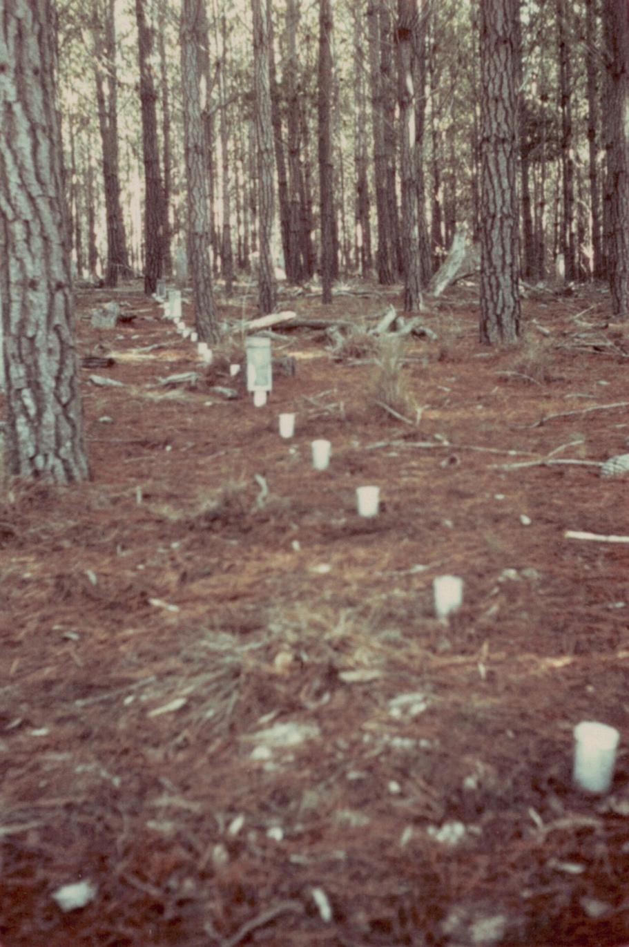 Lines normally were 3 to 5 miles (4.8 to 5.1 km) long, sometimes two or more radiating from a single start point near the landing pad, other times single lines from nearby landmarks. Temporary circular plots of 1 chain (about 20 m) radius were set out every 5 chains (about 100 m) along the line. Tree girth above buttress (GAB) was estimated using a “girth stick” (a graduated board that was a local variation of the Biltmore Stick) held up horizontally above buttress for each tree in the plot. Merchantable tree height was estimated by eye and sometimes checked using instruments (for example by an angular method using an Abney level set at 45° and a 100ft cloth tape for measuring the distance from the base of tree which equated to tree height (at least on flat ground)). The species, merchantable height and GAB of the trees greater than 1.5 m GAB within each plot were recorded in a survey field book. From one to three lines were surveyed in the vicinity each landing pad location, usually at the rate of one per day.