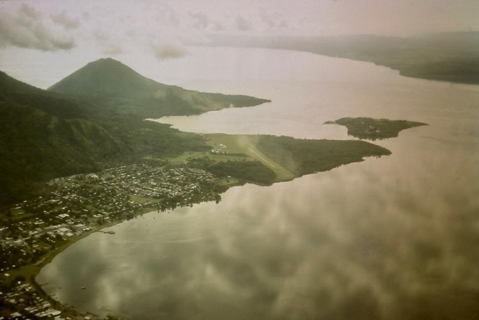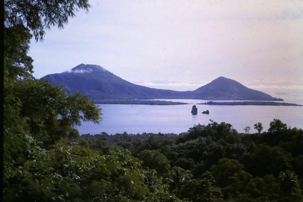 “The Beehives” (Dawapia Rocks) near the entrance to Simpson Harbour and said to be two parts of a volcanic plug in the hard core of the ancient large volcano that formed the present-day harbour and surrounding caldera. Just above the tip of the largest rock is the narrow causeway built by the Germans in 1884 joining Matupit Island on the right to the Rabaul mainland on the left. In the background are on the left the active and steaming Tarvurvur crater, behind it the cone of “The Mother” and to the right rear the cone of the “South Daughter”.
