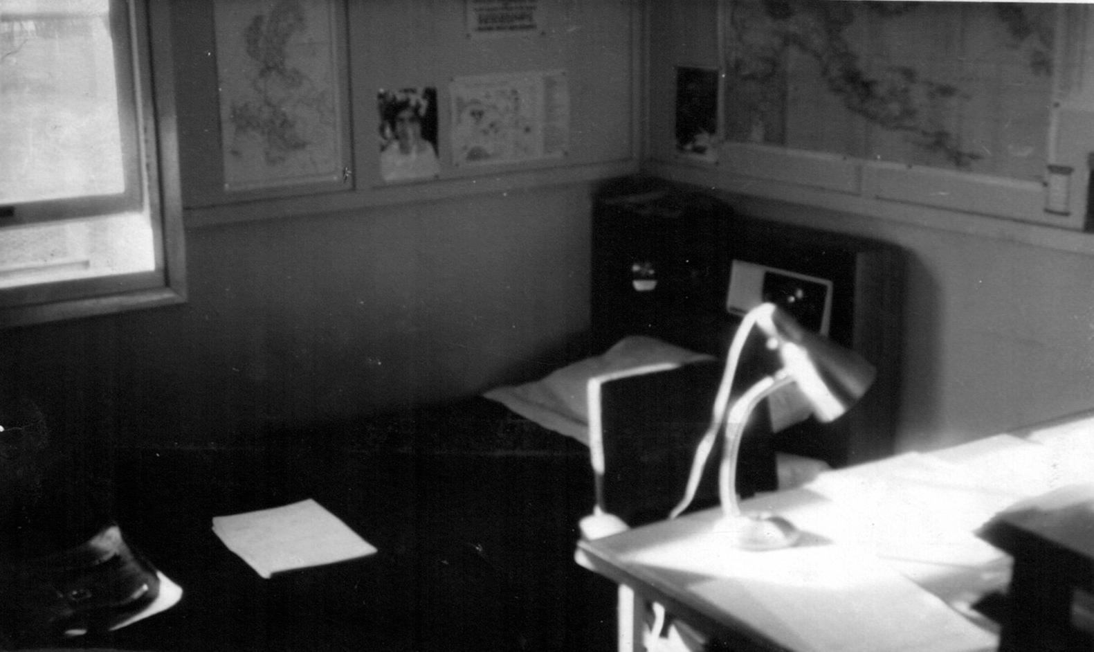 My room in 1965. Only enough room for a desk and chair, and a narrow bed. In the upper photograph the drainpipe from the sink in the common room above runs down one wall! In the corner near the towel rail are my obligatory axe and Biltmore stick. Maps of PNG, “Australia’s Western Neighbours” and Canberra adorn the walls. Occupying the whole wall opposite these photographs was a built in dressing table, mirror and wardrobe with drawers, a legacy left over from a former female occupant when the building served as a student nurses’ quarters in Acton.