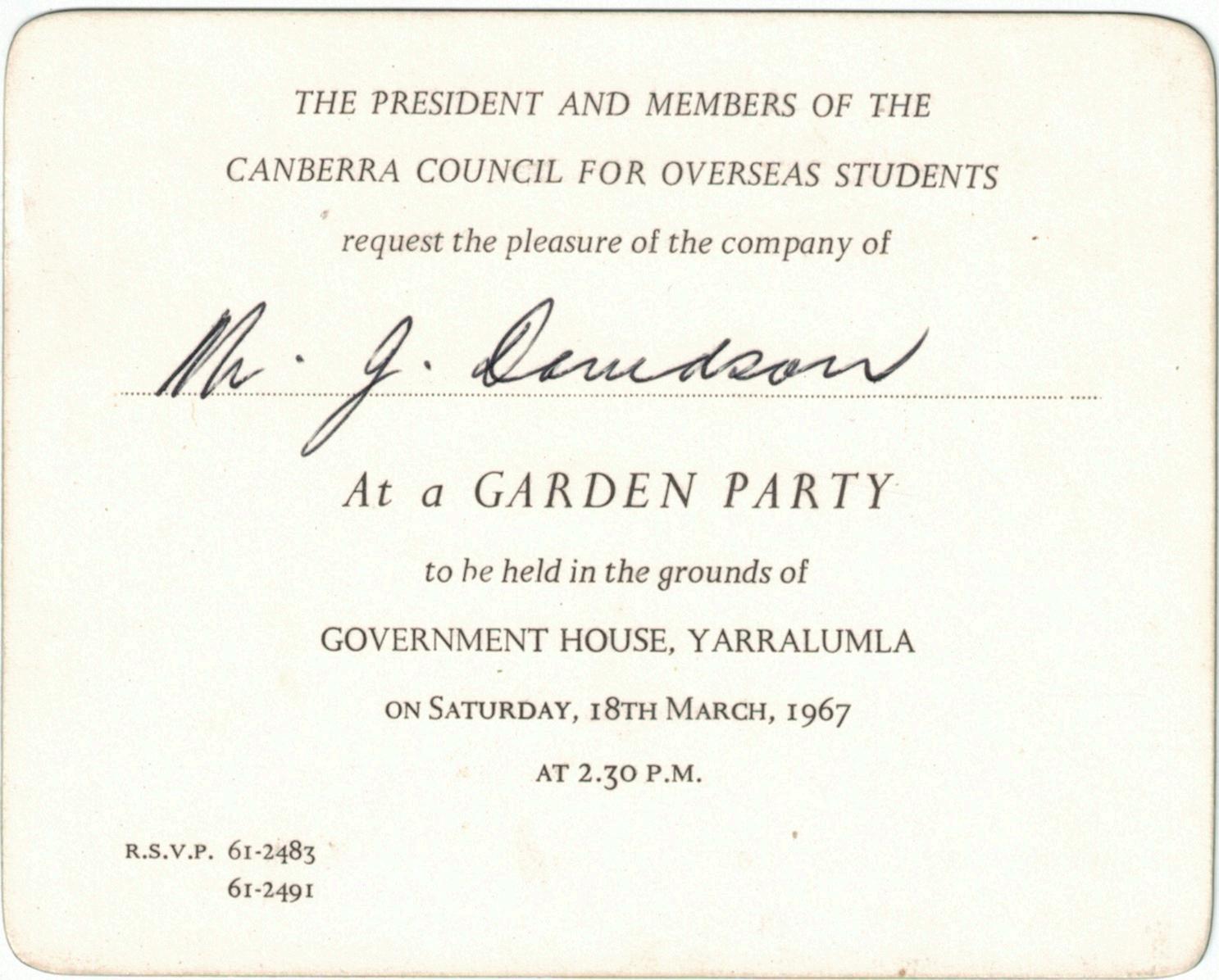 During the break between Terms 2 and 3, I travelled to Sydney to pick up a new Ford Falcon car that Gloria and I had decided to buy for £1,100 ($2,200) through a dealer in Kempsey, and drive it back to Canberra. Invitations for our wedding were sent out.