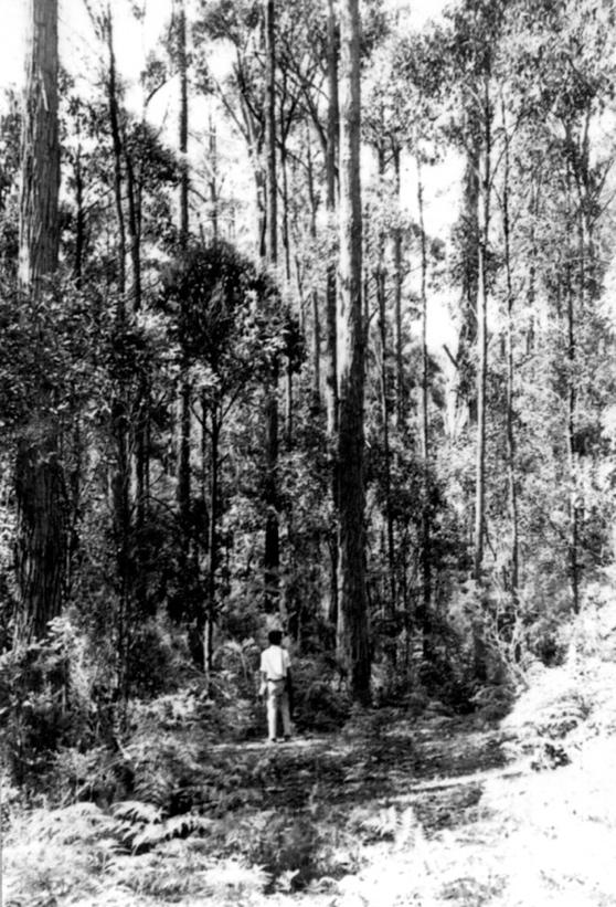 Left: Sample Plot 1, Hills Creek Forest Area, Eucalyptus obliqua, age 56 years, thinned 15 years before the photograph was taken, when the mean dominant height was 105 feet (32 m).
