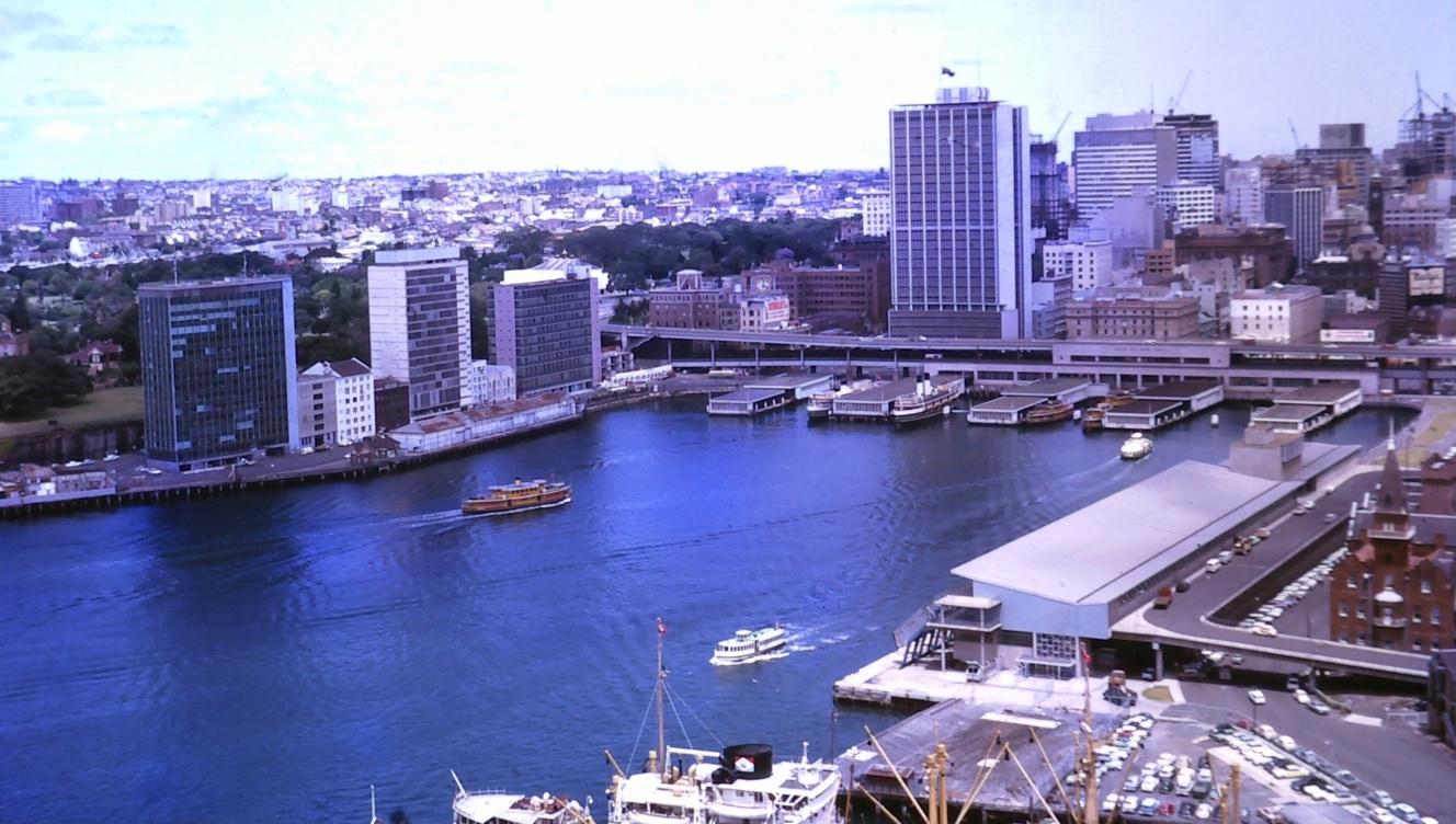 The AMP building at Circular Quay (with flag on top) was the tallest building in Sydney in 1965 and offered access for visitors to a covered observation deck on the roof. Construction of several other tall buildings nearby was underway, as indicated by the number of cranes deployed, but not yet for the later major high-rise buildings.