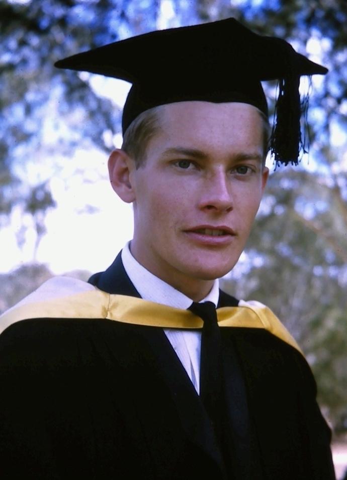 After being announced by the Dean of the Faculty of Science Prof. N H Fletcher (standing, centre, in magenta robes), I step forward (just left of centre) to accept my Bachelor of Science Degree scroll from the Deputy Chancellor of the UNE, in front of Members of the University Council, Guests and Senior Staff seated on the dais. The date was 10 April 1965.