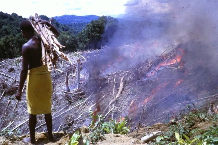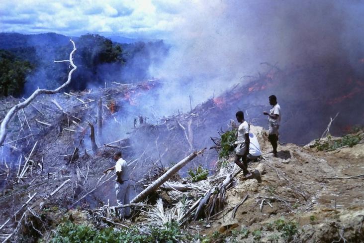 Above left and right: Plantation burn in Vudal LA Keravat, 1967. In the top left photograph plantation manager Robert Schneider (pointing) is directing operations. In the top right photograph the labourer is carrying firesticks, small bush saplings with hessian wrapped around one end and dipped in diesel fuel.