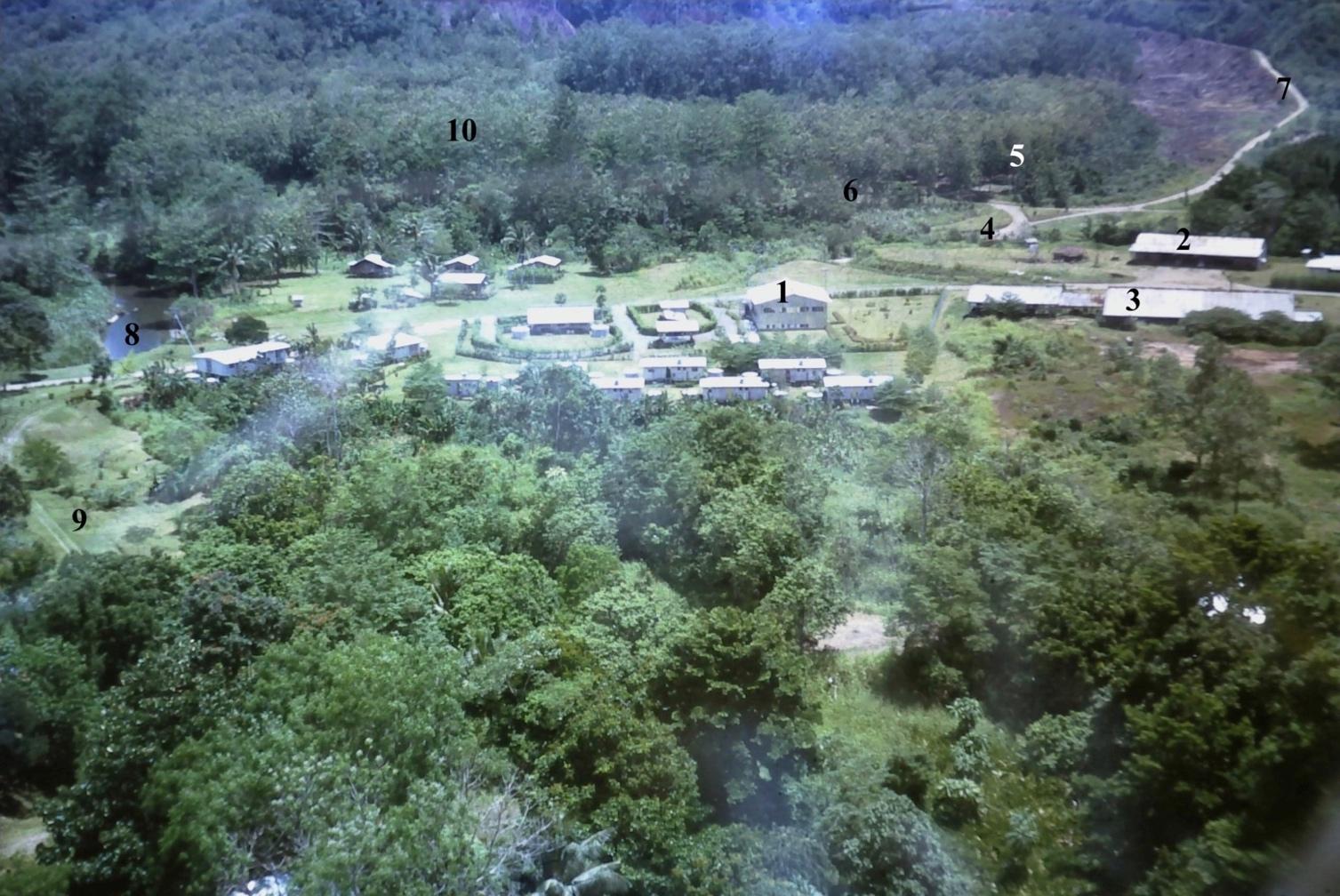 in mid-May to mid-July 1967. The survey’s generator was connected to the Kiap’s house (centre) for the duration of the survey. Although the Kiap’s residence was near new and was wired and fitted with electric lights, there was no 240 -volt electricity generation available up until that time in Ioma. The playing field was an ideal landing ground for the helicopter that was providing fulltime support for the survey. The track in the bottom right led down to a substantial highwire suspension bridge from which the bravest of us dived or jumped into the river for a swim.