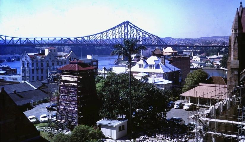Top left and right, and above left: Wedding day photographs. Gloria and her mother made the wedding dress, trains, and veil and bridesmaids’ gowns. Twin cars were used, the one in front for the bride with a small bride doll on the bonnet dressed in a miniature copy of the bridal gown, the second for the bridesmaids with two small bridesmaid dolls on the bonnet dressed with miniature copies of the bridesmaids’ gowns. Bottom right: Story Bridge and surrounds, Brisbane, Queensland in December 1965 seen on the early part of our honeymoon.