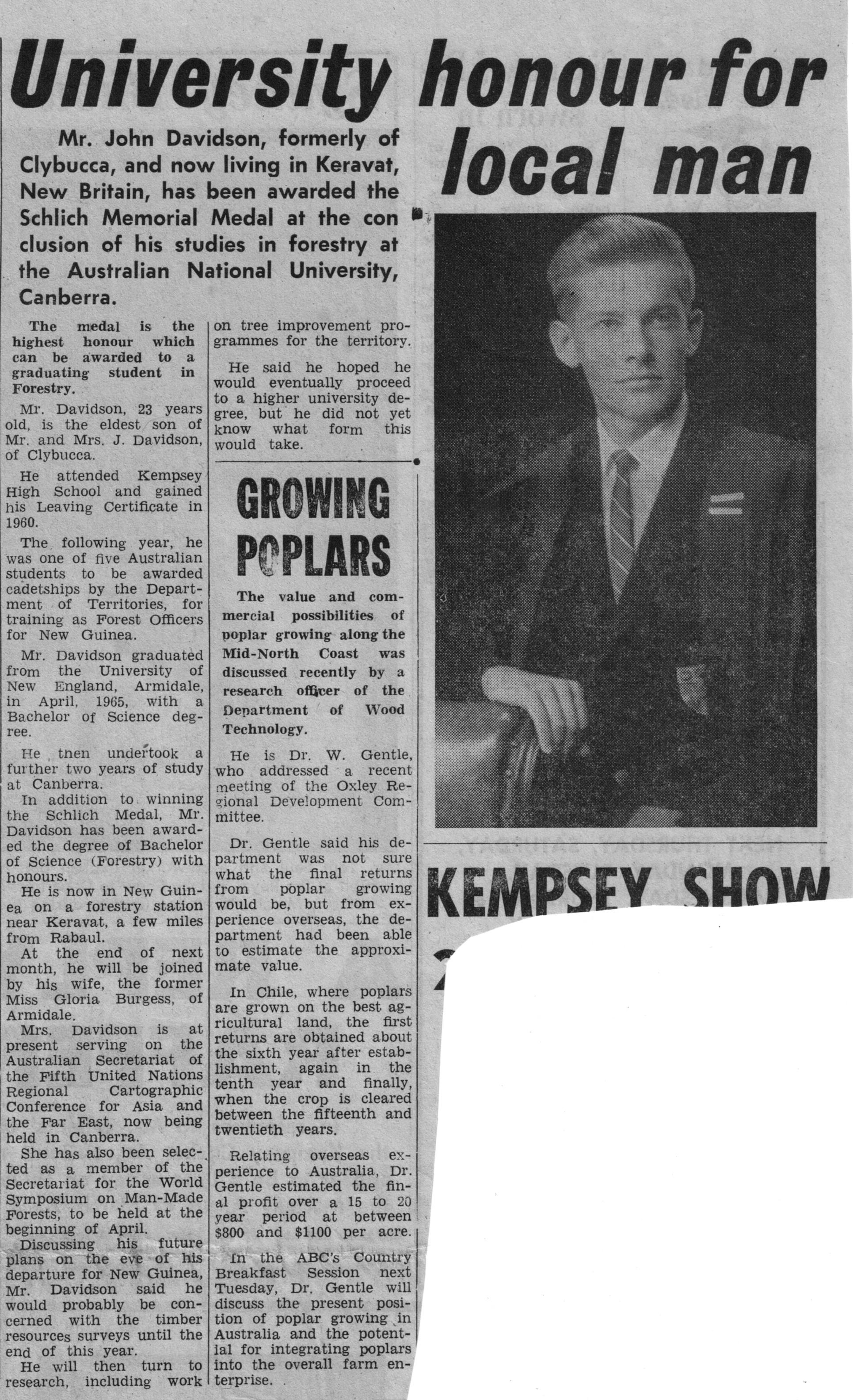 At the end of 1965 three ex Fourth Year students/ex TP&NG Cadets, Chris Borough, Bob Bruce, and Rex Grattidge left Canberra to take up their posts in the Territory. John Harrison completed his forestry degree in 1965 but did not go back to TP&NG after graduation. During his field year in 1963 he was bitten by a Papuan Black Snake near Brown River Station. After graduation he joined the Division of Wood Technology, NSW Forestry Commission