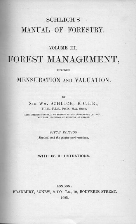 A presentation original fifth edition of Schlich’s Manual of Forestry Volume III Forest Management published in early 1925 and signed on the flyleaf by Sir William Schlich on 25 February 1925, only eight months before his sudden death on 24 October 1925.
