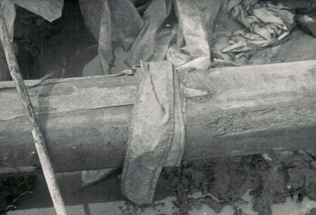 Inflatable canvas sleeve used to achieve a leak proof seal between the butt end of the pole and the metal cap (recently removed before this photograph was taken, so not shown here) through which the preservative was introduced.