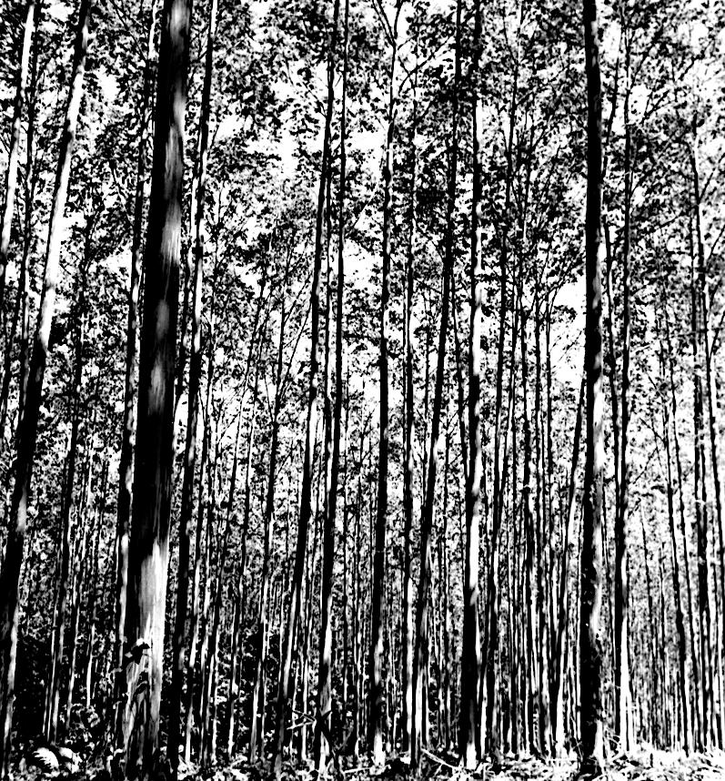 Paper Industries Corporation of the Philippines (PICOP) at the time had extensive E. deglupta plantations near Bislig Bay in Mindanao. In plantations with an initial stocking of about 625 680 stems/ha an average yield of 25 30 m3/ha/yr (over bark to 10 cm top diameter) was obtained over a ten year rotation (Site Quality Class 2). Much higher yields of 40 60 m3/ha/yr (total volume over bark) could be obtained from higher stocking on above average sites (Site Quality Class 1) in Mindanao (photograph at left).