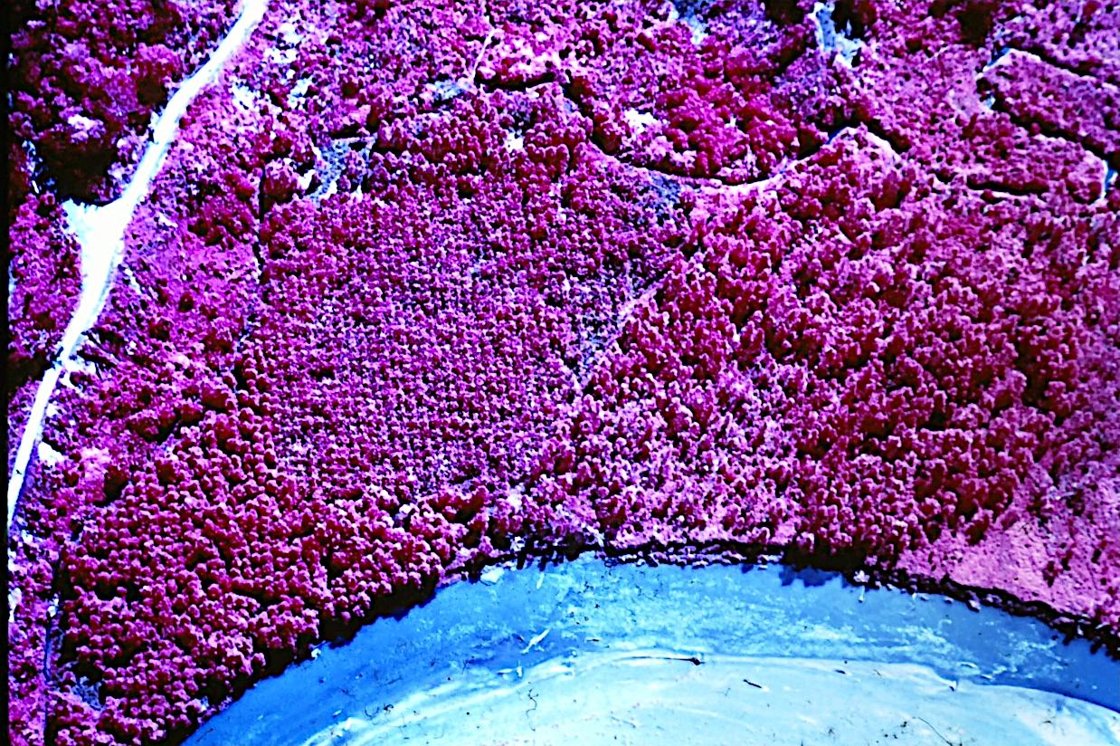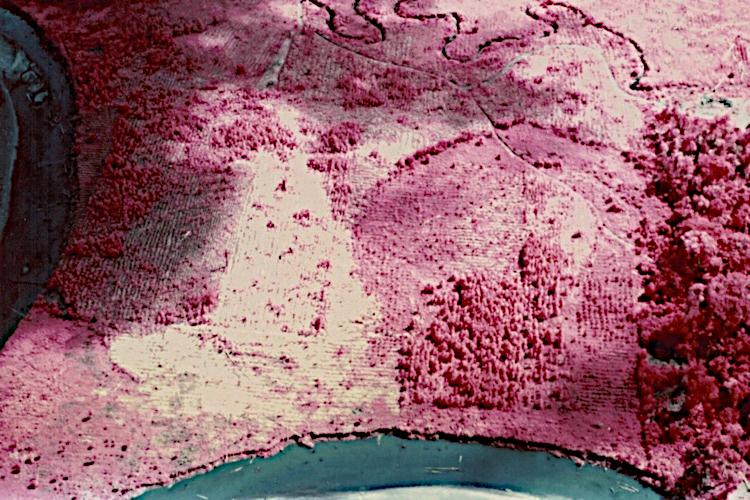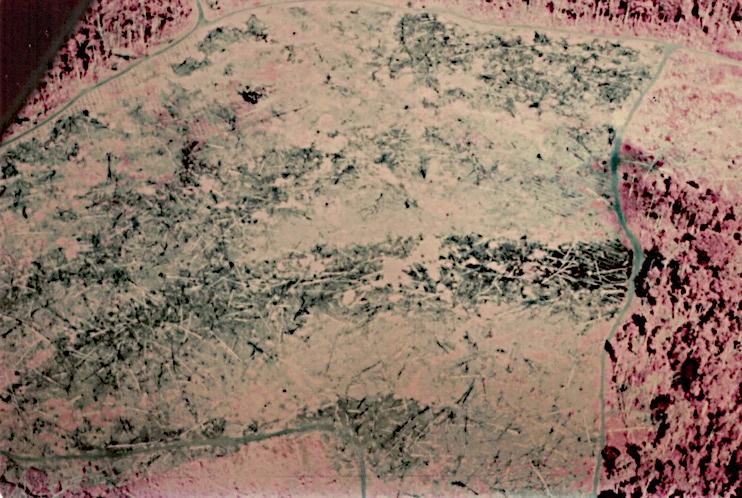 Matching near vertical aerial photographs of simulated pulpwood logging at Baku in 1972. Top: Natural colour (Kodak Kodachrome 35 mm), Bottom: colour infrared (Kodak Aerochrome III 1443 35mm). The top photograph reveals a considerable number of small logs and slash left on the ground, the bottom photograph shows in red live vegetation remaining, and the damp ground in grey, especially on the snig tracks at the top.