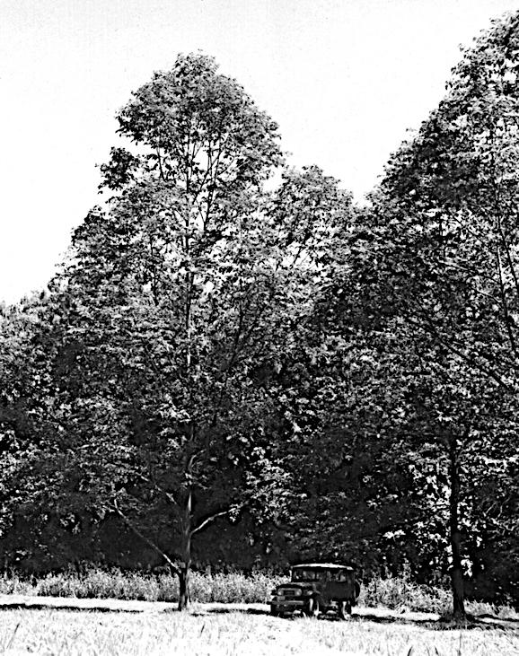 Trial grafted seed orchard at Keravat in 1972, age about four years. Left: Two widely spaced trees in flower. Right: Compatible patch graft union about 30 cm in diameter and 20 cm above the ground on the tree located to the left of the vehicle.