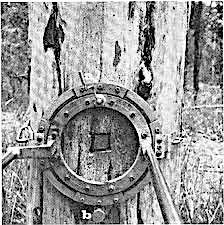 in 1972. Site preparation was clearfelling and burning after logging. Except for one small patch and a few scattered trees on higher ground or perhaps on an ashbed, or both, waterlogging, too wide initial spacing and poor weed control mean most this plantation had a poor start. An indication of the wetness of the locality can be seen from the free water lying on the track in the bottom right hand corner. A corduroy of small poles had been laid on a particularly boggy length of track, and a small bulldozer was on standby to tow vehicles that became bogged.