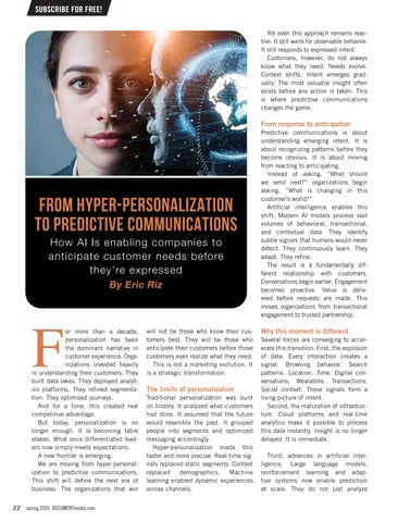 From Hyper-Personalization to Predictive Communications How AI Is enabling companies to anticipate customer needs before they’re expressed By Eric
