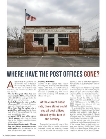  Kentucky has seen the most post office closures, as 64% of the post offices ever opened in the state are now shut.