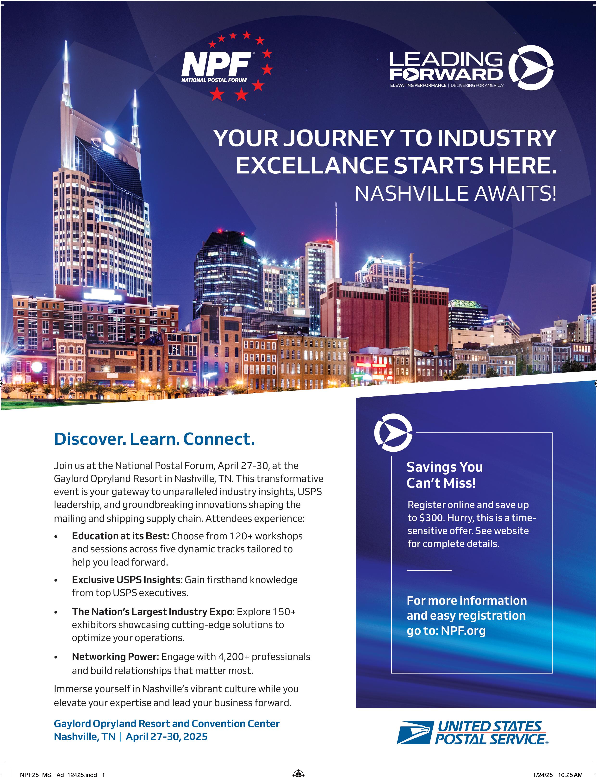 January 1 always brings about a sense of renewal and new possibilities. Many people adopt personal resolutions such as vowing to exercise more, eat better, and drink less, while also striving to improve various aspects of their professional lives. As mailers, there are lots of aspects of our operations that we could look at as opportunities for improvement. Cutting postage costs, increasing usage of USPS postage discounts (who doesn’t want to save money on mailings they’d likely be sending anyway?), gaining greater customer engagement from our mail pieces… the list goes on. Within this issue, there is a plethora of ideas that can help you make sure your mailing operation starts out 2025 on the right foot.