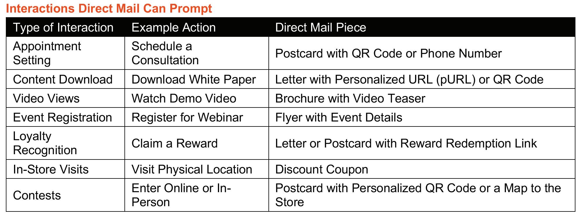 You can leverage different direct mail pieces to boost customer engagement, as illustrated in the table on the next page. Here is how each type of interaction can prompt desirable actions.