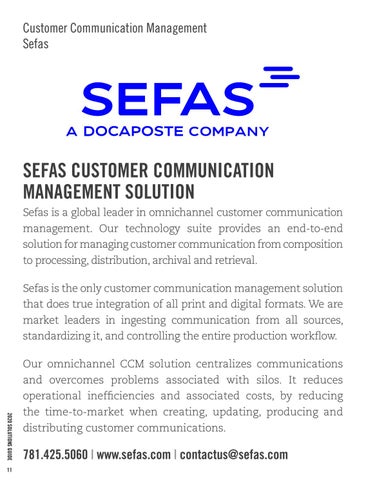 SEFAS CUSTOMER COMMUNICATION MANAGEMENT SOLUTION Sefas is a global leader in omnichannel customer communication management. Our technology suite provides an end-to-end solution for managing customer communication from composition to processing, distribution, archival and retrieval. Sefas is the only customer communication management solution that does true integration of all print and digital formats. We are market leaders in ingesting communication from all sources, standardizing it, and controlling the entire production workflow. Our omnichannel CCM solution centralizes communications and overcomes problems associated with silos. It reduces operational inefficiencies and associated costs, by reducing 2020 SOLUTIONS GUIDE 11