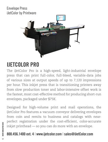 IJETCOLOR PRO The iJetColor Pro is a high-speed, light-industrial envelope press that can print full-color, full-bleed, variable-data jobs of various sizes at output speeds of up to 7,120 impressions per hour. This inkjet press that is transitioning printers away from slow production toner and labor-intensive offset work is the fastest, most cost-effective method for producing short-run envelopes, packaged under $75K.