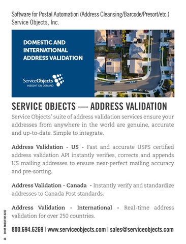 SERVICE OBJECTS — ADDRESS VALIDATION Service Objects’ suite of address validation services ensure your addresses from anywhere in the world are genuine, accurate and up-to-date. Simple to integrate. Address Validation - US - Fast and accurate USPS certified address validation API instantly verifies, corrects and appends US mailing addresses to ensure near-perfect mailing accuracy and pre-sorting. Address Validation - Canada - Instantly verify and standardize addresses to Canada Post standards. 2020 SOLUTIONS GUIDE 40