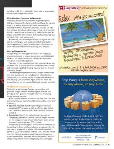 including in Q2 if it is validated), it may lead to unnecessary research and budget inaccuracies. 2020 Milestones, Variances, and Anomalies Identifying events or milestones that triggered expense changes, measuring the duration and quantifying the expense impact, as well as determining if these events will be repeated in 2021 is required. Carrier rate changes fall into this category. Scheduled rate increases, via a carrier contract and/or a General Rate Increase (GRI), should be notated, as should unplanned rate increases that may have occurred (e.g. UPS and FedEx peak surcharges). Additionally, the parcel expense impact of significant 2020 operational changes, such as adjustments to distribution center operations or closing store locations, should also be taken into consideration when planning 2021 expense. Risks and Opportunities Incorporating risks and opportunities into the budgeting process is intended to provide guidance on potential budget variance, but these items are not defined well enough to include as an actual budget item. Examples of risks include higher than expected carrier rate increases, loss of pricing discounts due to decreased volume, and increased expedited shipping expense (e.g. due to order processing delays). Despite the gloomy expense outlook, budget opportunities may exist as well, and can include carrier rate reductions (through an RFP), shifting volume to more deferred services, and reducing split shipments. Again, these are items are prospective and not yet executed (although possibly planned). Rate Increase Forecast Performing a rate increase forecast can provide a wellgrounded budget baseline. Performing this exercise also provides a more granular hindsight view when measuring budget expense variance. A rate increase forecast should include both base rates and accessorial charges (each should be broken out by carrier and/ or service): Base rate increases: Both the percentage increase and calculated CPP increase, as well as effective date (scheduled carrier GRI and/or contract effective date) should be included. Accessorials: Identify the highest impact accessorial charges (e.g. residential delivery, fuel surcharge), estimate the net charge increase amount (drawing on recent annual increases), and budget as a CPP increase. The process of forecasting GRI and accessorial increases can be daunting for those who have not done so previously. On the next page is an example of a basic table used to calculate a portion of 2020 rate increases for three FedEx services. Please note, this example is not precise as the pricing components shown are calculated separately and do not take into account compounding effects of some charges (e.g. fuel surcharge). SEPTEMBER-OCTOBER 2020 PARCELindustry.com 33