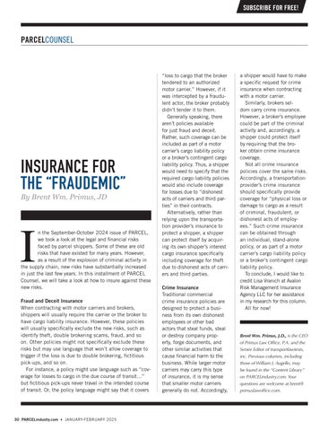 In the September-October 2024 issue of PARCEL, we took a look at the legal and financial risks faced by parcel shippers. Some of these are old risks that have existed for many years. However, as a result of the explosion of criminal activity in the supply chain, new risks have substantially increased in just the last few years. In this installment of PARCEL Counsel, we will take a look at how to insure against these new risks.