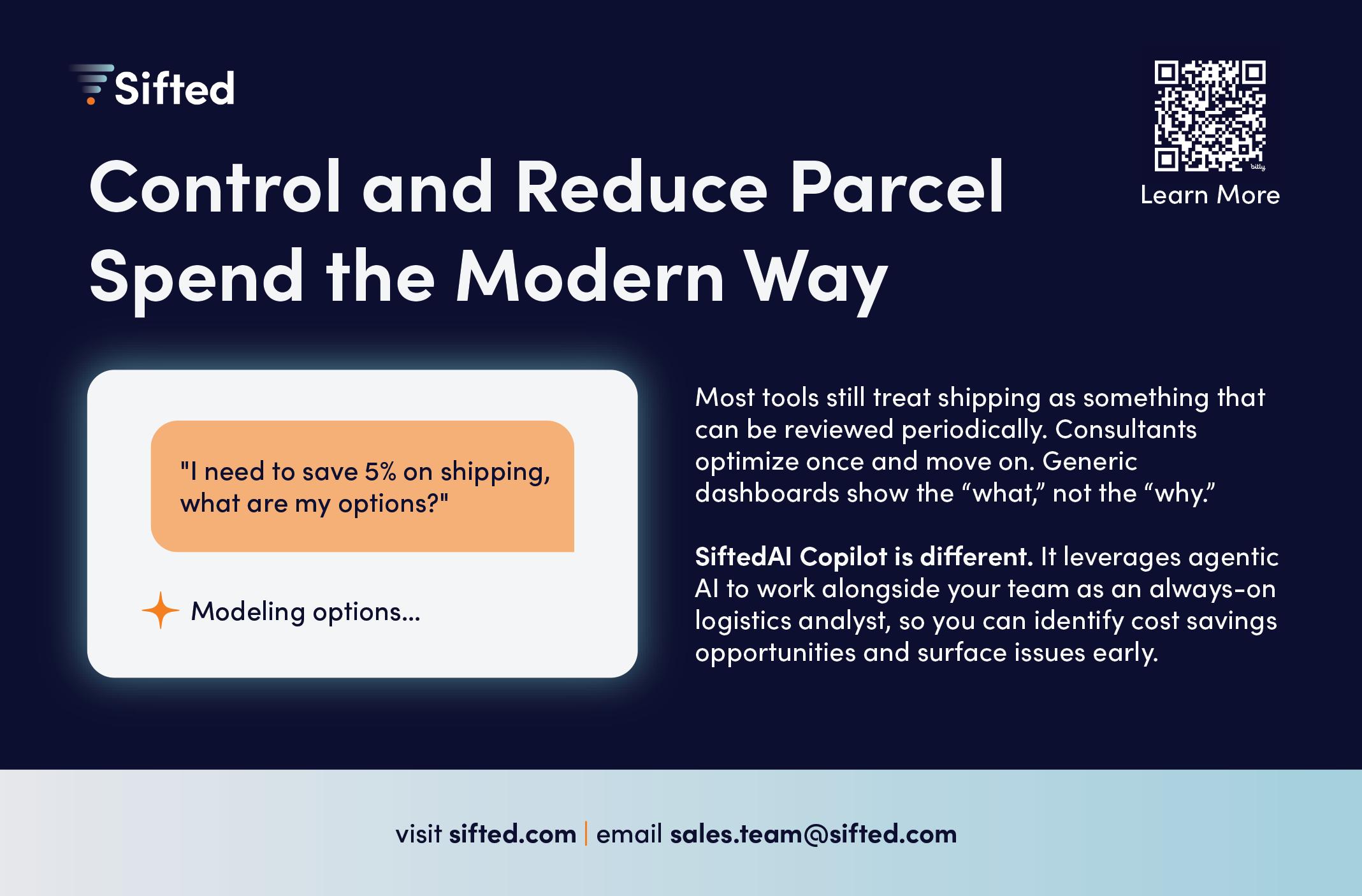 Sifted is a Logistics Intelligence provider that helps direct parcel shippers and 3PLs take control of shipping spend. Their software, SiftedAI, provides continuous visibility into parcel cost and performance — uncovering hidden inefficiencies, highlighting savings opportunities, and surfacing issues before they impact the P&L. SiftedAI Copilot layers agentic AI into the platform as an always-on logistics analyst. It actively inspects shipping data, analyzes scenarios, and guides confident decision-making around parcel spend, service levels, and carrier strategy.