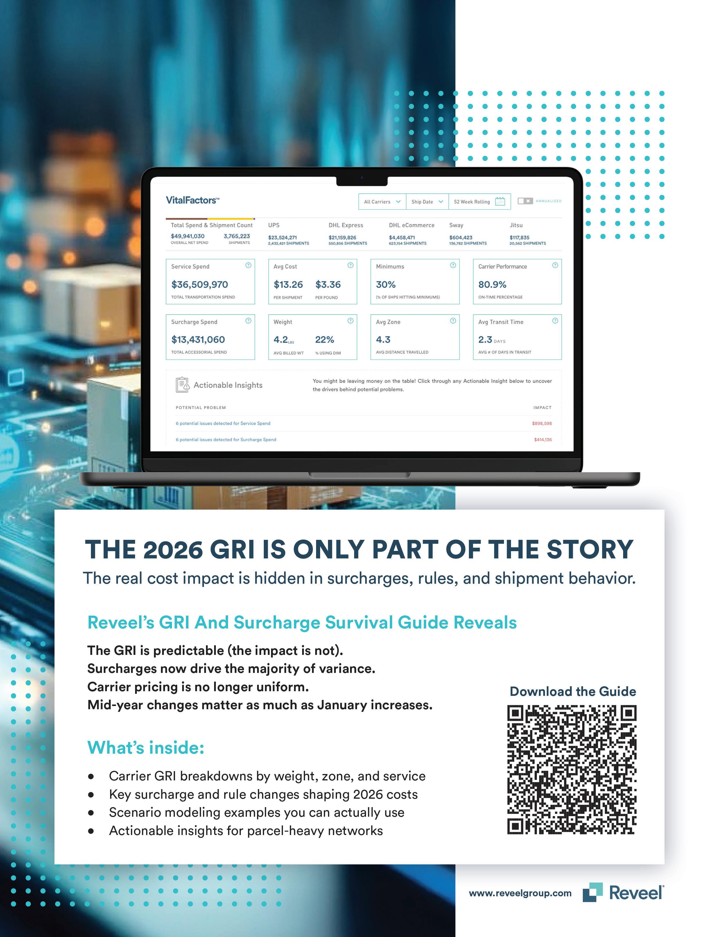The published 2026 GRI is only part of the story. The real cost impact is buried in surcharges, evolving rules, and shipment behavior that rarely show up in headline increases. Reveel’s 2026 GRI & Surcharge Survival Guide breaks down how carrier GRIs actually apply by weight, zone, and service, and why surcharges now drive most parcel cost variance. With scenario modeling and actionable insights built for parcel-heavy networks, the guide reveals where costs really change and how to plan for them. Download the guide to see what invoices will show next.