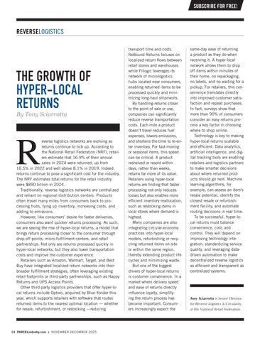 everse logistics networks are evolving as returns continue to tick up. According to the National Retail Federation (NRF), retailers estimate that 16.9% of their annual sales in 2024 were returned, up from 16.5% in 2022 and well above 8.1% in 2019. Indeed, returns continue to pose a significant cost for the industry. The NRF estimates total returns for the retail industry were $890 billion in 2024. Traditionally, reverse logistics networks are centralized and reliant on regional distribution centers. Products often travel many miles from consumers back to processing hubs, tying up inventory, increasing costs, and adding to emissions. However, like consumers’ desire for faster deliveries, consumers also want quicker returns processing. As such, we are seeing the rise of hyper-local returns, a model that brings return processing closer to the consumer through drop-off points, micro-fulfillment centers, and retail partnerships. Not only are returns processed quickly in hyper-local networks, but they also lower transportation costs and improve the customer experience. Retailers such as Amazon, Walmart, Target, and Best Buy have integrated localized return networks into their broader fulfillment strategies, often leveraging existing retail footprints or third-party partnerships, such as Happy Returns and UPS Access Points. Other third-party logistics providers that offer hyper-local returns include Optoro, acquired by Blue Yonder this year, which supports retailers with software that routes returned items to the nearest optimal location — whether for resale, refurbishment, or restocking —reducing