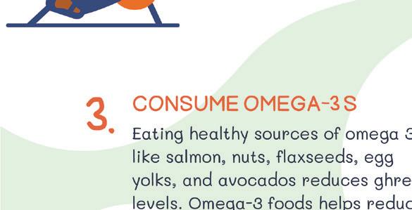 7. Eat Omega-3 Rich Foods — Foods rich in omega-3 fats help the functioning of leptin your body. Eating healthy sources of Omega-3 like salmon, nuts, flaxseeds, egg yolks and avocados reduces ghrelin levels by increasing satiety.