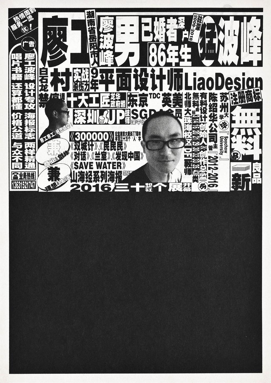 Chinese designer Bofeng Liao made a similar statement with his advertising flyers. He included his name, work, achievements, and contact in a compacted space with a whimsical tone. [Fig. 29-30] Liao’s appreciation for the ugly design is also evident in his Name Card for AGI in China [Fig. 31-33] Alliance Graphique Internationale (AGI), based in Europe, is one of the most prestigious clubs for graphic designers. In his work, he made a business card for each one of the 32 Chinese members of AGI. Rather than do it completely by himself, he commissioned a local print shop in the capital city of each of the Chinese provinces. Liao brought together the elite and intellectual side of graphic design with the perceived lower-end printer shop design. He did not execute it in a pejorative manner, but rather with a 6-metre-long careful analysis dissecting all the cards in an anthropological sense to objectively present ‘the status quo of Chinese folk design,’ in his own words.54