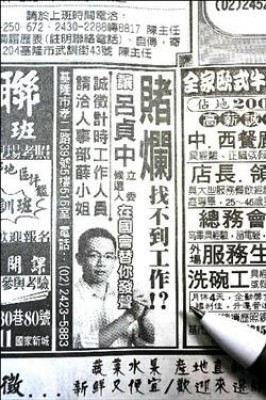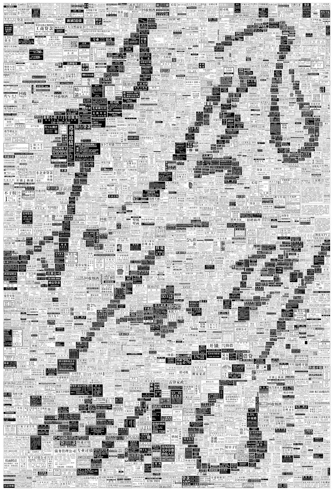 The critique of capitalism is a common theme in works related to the New Ugly, understandably because of the intrinsic, commercial qualities of the ordinary and the ugly. Designers aim for the hyper-economic attribute of the style, and take advantage of it with satire and irony to criticise the commercialisation and the detriment of capitalism. In his poster for Foudertype Beijing, Jianping He discussed a multitude of topics with a simple technique. He made a collage of Chinese calligraphic writing, ‘The East Wind Prevails Over the West Wind,’ with irregular, black and white rectangles. [Fig. 36] Zoomed in, the shapes appear to be almost microscopic advertisements of loan sharks, pawn shops, job openings, and property selling which he gathered and possibly reformatted from Chinese newspapers. The hypocrisy of the Chinese government's performance of communism through state capitalism in a capitalist world reveals itself through the crippling debt crisis of Chinese citizens. Alternatively, in He’s own words, ‘Eastwind wins against Westwind. Communism against Capitalism’.62
