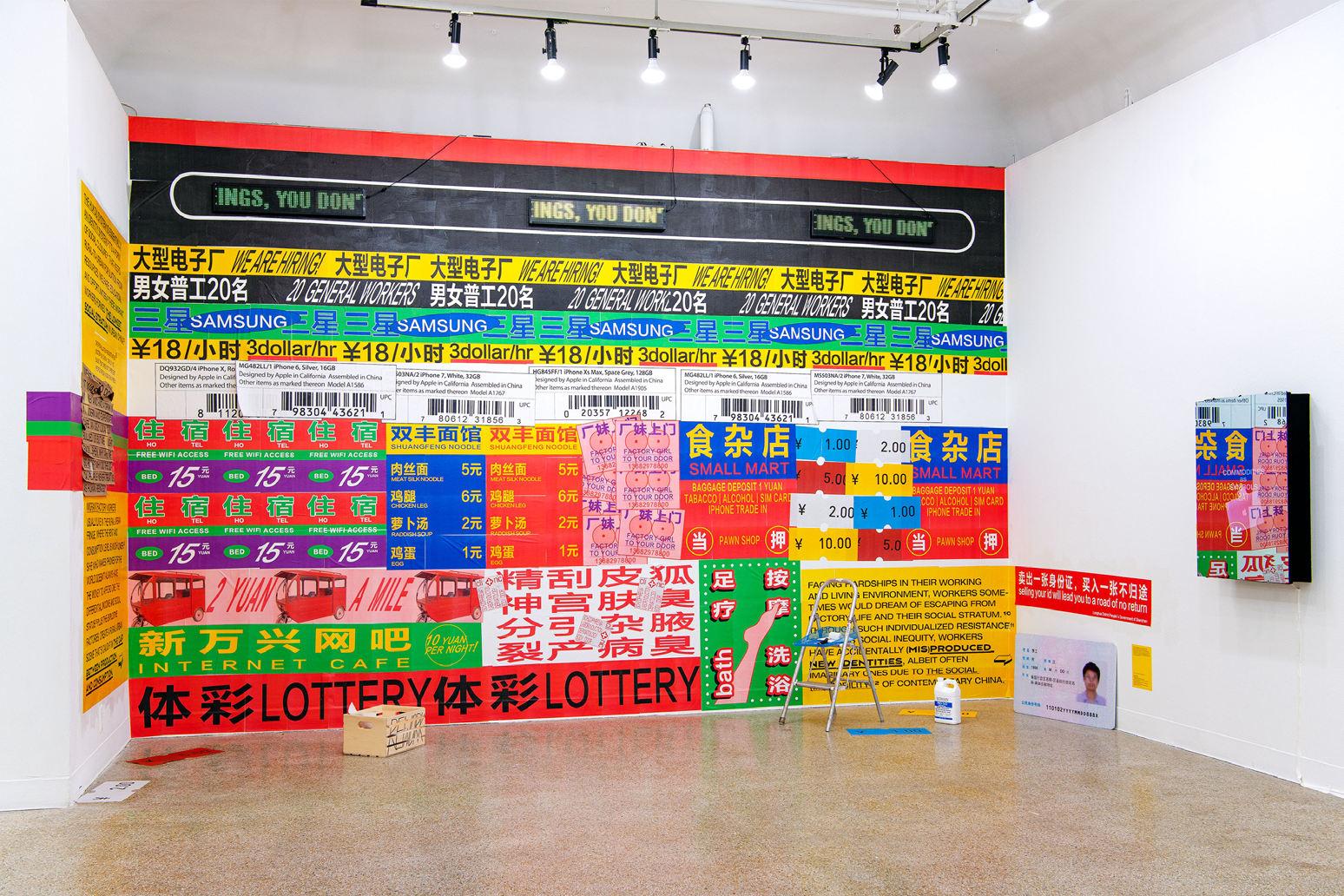 Repeating texts in stretched and angled typefaces and jarring colours, advertisements for internet cafes, lottery tickets, prostitution, and pawn shops, disproportionate price tags that show a low cost of living contrasted with giant iPhone barcode labels are all pasted on a crowded wall for Li’s thesis work, On Being a Factory Worker. [Fig. 34] She emphasised the huge disparity between labour and product, the producer and the consumer, and the exploited and the privileged through her ‘unconsciously anti-designed visual outputs of migrant workers in China.’ Migrant workers, or Mingong [民工] in China face a twofold abuse: On one hand, companies from the global north take advantage of the cheap manual labour in China by overproducing in a country with poor labour laws. On the other hand, coming from mostly rural and underdeveloped areas, migrant workers lack access to many rights-including medical care, education rights, and pension-like locals of the area, due to China’s outdated Hukou system.58 On Being a Factory Worker is a fierce critique of China’s modernisation process that values capital over capita, but it also reminds designers to acknowledge their source of inspirations and financial privilege.
