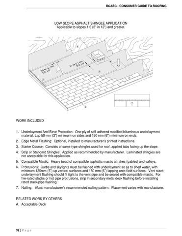 WORK INCLUDED 1. Underlayment And Eave Protection: One ply of self-adhered modified bituminous underlayment material. Lap 50 mm (2") minimum on sides and 150 mm (6") minimum on ends. 2. Edge Metal Flashing: Optional, installed to manufacturer’s printed instructions. 3. Starter Course: Consists of same type shingles used for roof, applied tabs facing up the slope. 4. Strip or Standard Shingles: Applied as recommended by manufacturer. Laminated shingles are not acceptable for this application. 5. Compatible Mastic: Heavy bead of compatible asphaltic mastic at rakes (gables) and valleys. 6. Protrusions: Curbs and skylights must be flashed with underlayment so as to shed water, with minimum 125mm (5") up vertical surfaces and 150 mm (6") lapping onto field surfaces. Vent stack underlayment flashing should fit tight to the vent pipe and be sealed with compatible mastic. For fire-rated stacks or hot pipe protrusions, strip in secondary metal deck flashing before installing rated stack/pipe flashing. 7. Nailing: Note: manufacturer’s recommended nailing pattern. Placement varies with manufacturer. RELATED WORK BY OTHERS A. Acceptable Deck