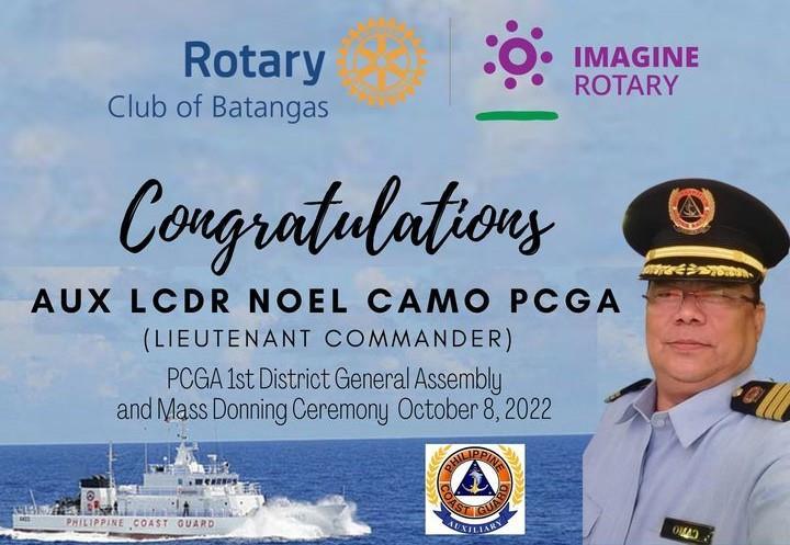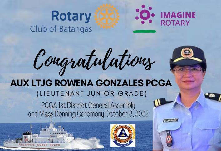 Four (4) members of the Rotary Club of Batangas, namely, GSP Arnel Pulla, PP Armando “Boyet” Gonzales, PP Rowena “Weng” Gonzales and Rtn Noel Camo, have successfully joined the memberships with the Philippine Coast Guard Auxiliary (PCGA). The 1st District General Assembly and Mass Donning Ceremony of the Philippine Coast Guard Auxiliary was held last October 8, 2022 at Aquamarine Recreational Center in Lipa City. All applicants may be considered for initial enrollment provided that the applicant meets all eligibility requirements for enrollment and must, prior to induction, without fail, attend the PCGA indoctrination / seminar to be conducted by the PCG officers or as directed by the Commandant PCG. There are six (6) specialties where the prospective PCGA members can join in; namely, (1) Maritime Search and Rescue, (2) Maritime Environment Protection, (3) Marine Safety, (4) Maritime Community Relations, (5) Education, and (6) Youth Development.