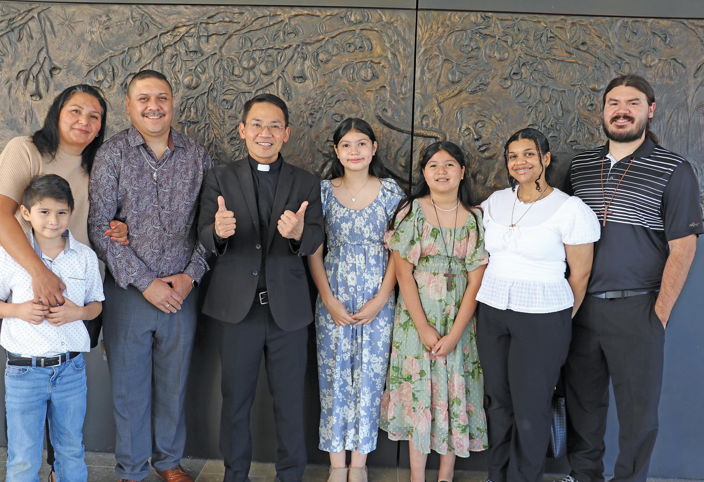 THE ADAME-ESCALANTE FAMILY IS WITH FR. BAO THAI, RECTOR OF CHRIST CATHEDRAL, MAKENNA AALIYAN WELLS AND HER GODFATHER DAVID HARDEN. PHOTO BY JORGE LUIS MACÍAS