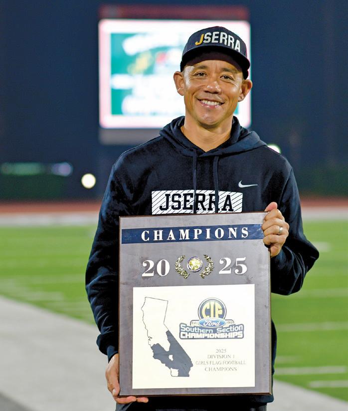 COACH BRIAN ONG HOLDS THE CHAMPIONSHIP PLAQUE. PHOTOS COURTESY OF JSERRA FLAG FOOTBALL