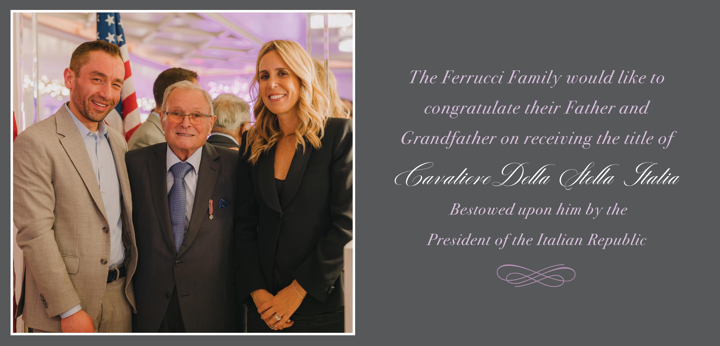 “This honor is especially meaningful for me, because it acknowledges my uninterrupted interest in promoting business and developing healthy relationships between Italy and the U.S.,” said Ferrucci, who grew up in Amorosi, a small town near Naples, before immigrating to the U.S. in 1957 to join his fellow Italian immigrant wife, Maria, in New Haven, Conn.