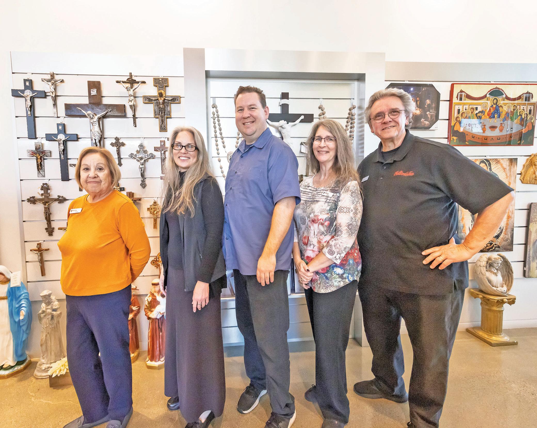 THE MANAGER OF THE CHRIST CATHEDRAL SHOP, STEVE PETERS, CENTER, POSES WITH HIS STAFF: VIVIAN GOMEZ, DANIELLE TAYABAS, BETTY ARNOLD AND MATTHEW ARNOLD. PHOTOS BY ALAN WENDELL/DIOCESE OF ORANGE