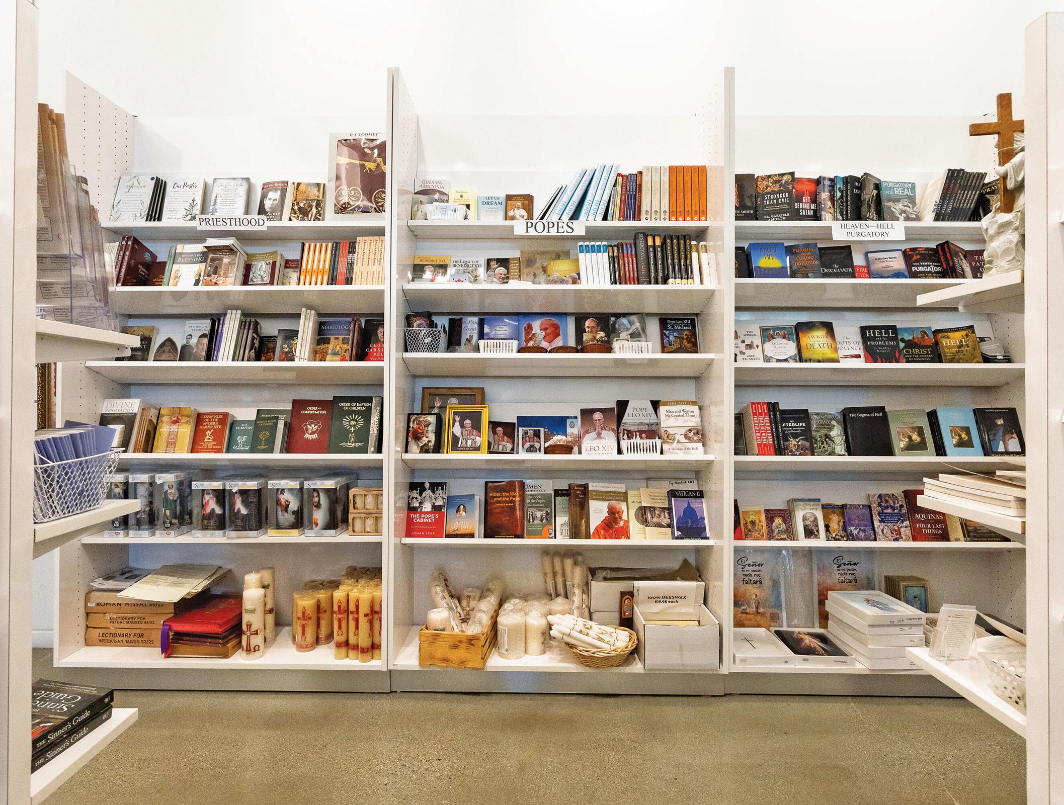 THE CHRIST CATHEDRAL SHOP OFFERS ABOUT 8,000 BOOK TITLES, INCLUDING CHILDREN’S BOOKS AND POPE BIOGRAPHIES.